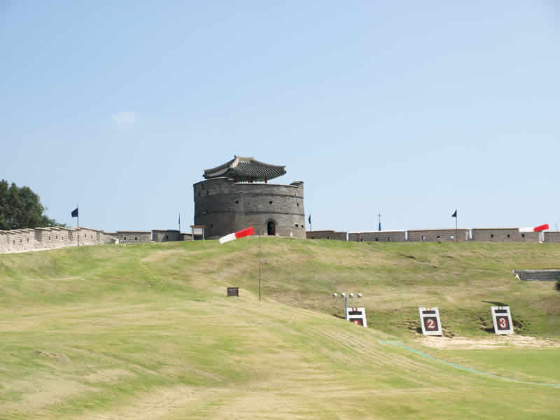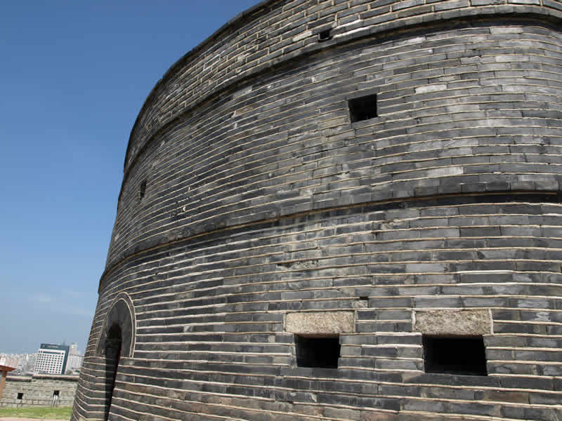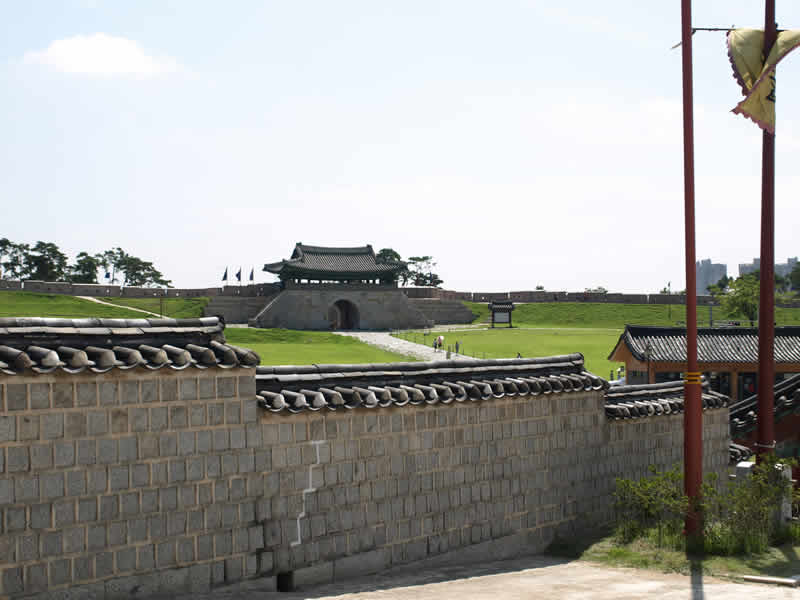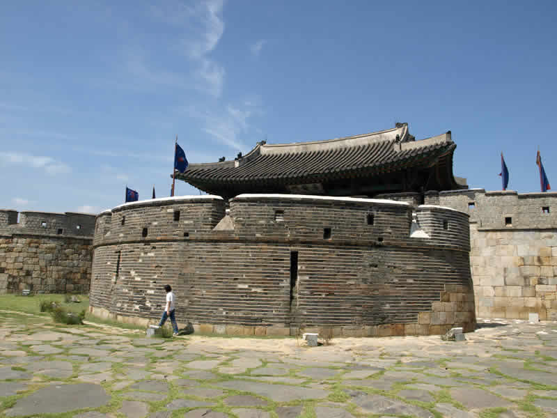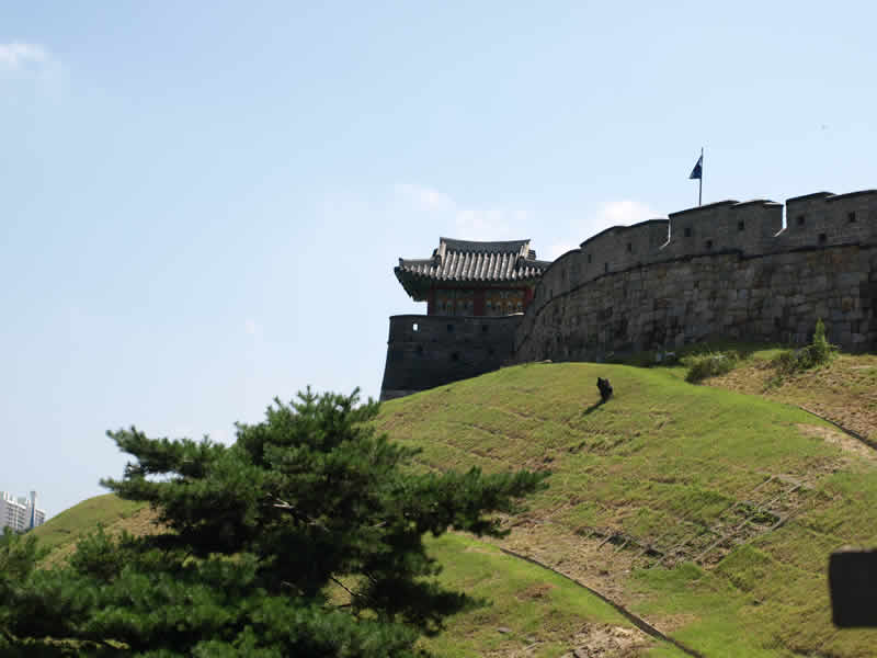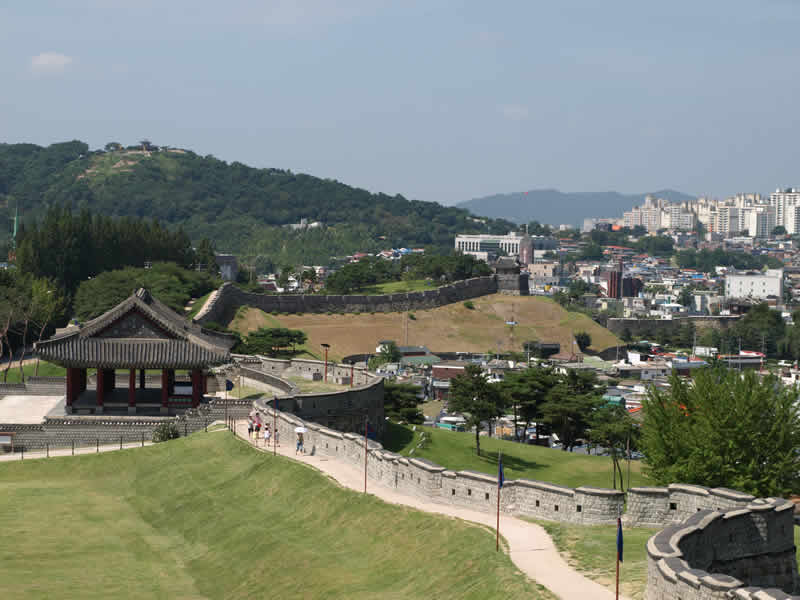 | ソウルの南約50kmに位置する水原は、街の中心部に石と煉瓦を併用する西洋の建築技術を取り入れて造った、総延長5.7kmの城壁で囲まれています。 |