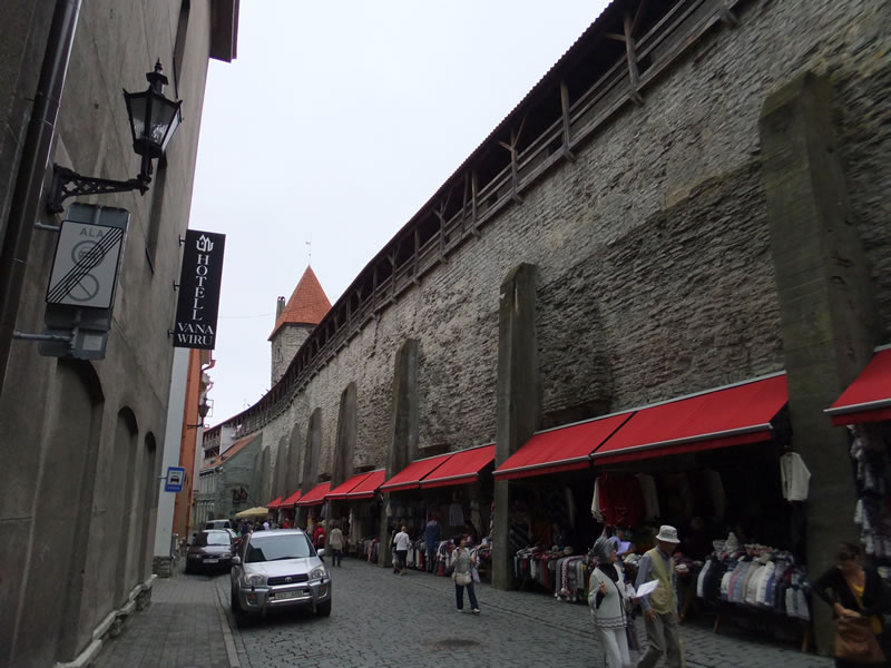 中世の城壁がそのまま残り、その下にはいくつもの露店が並ぶ「セーターの壁」