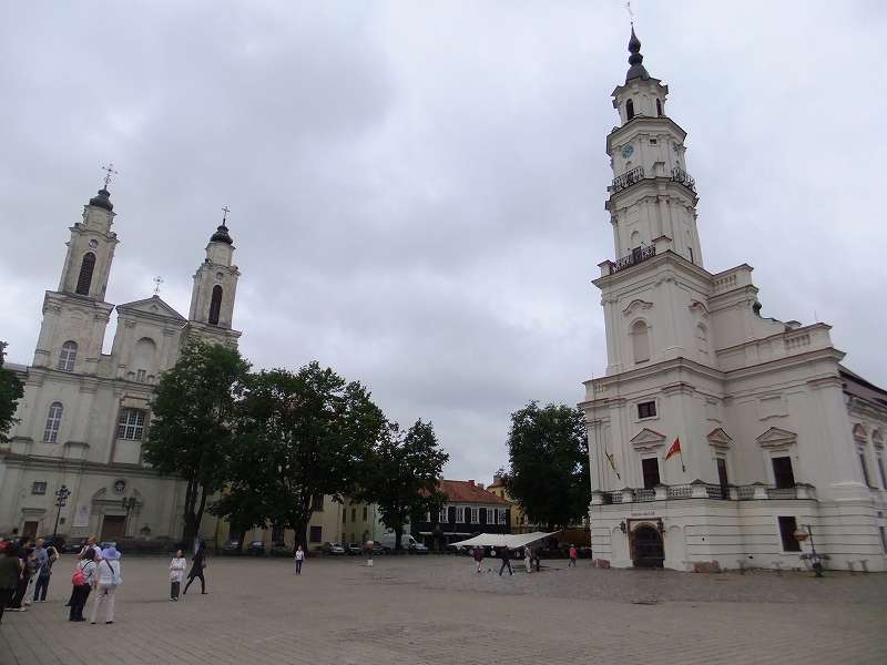 ![]() カウナス旧市街の中心にある市庁舎広場 右側の建物が旧市庁舎 一時は監獄として利用されていたこともあるが、現在は結婚登記所となっている 左側の双塔の建物はイエズス教会 |